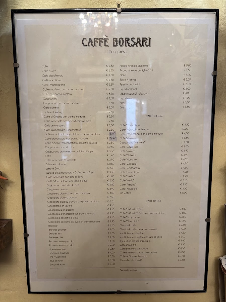 As you step inside, you're greeted by the comforting aroma of freshly brewed coffee and the sweet scent of pastries. The café's intimate atmosphere is enhanced by the bustle of patrons enjoying their daily rituals—be it a quick espresso or a leisurely breakfast. Caffe Borsari is not just a place to grab a bite; it’s an experience that draws you in with its warm ambiance and hospitable staff.